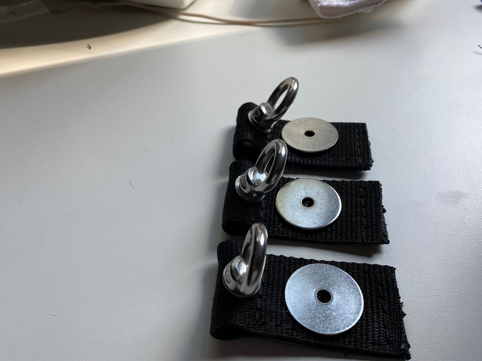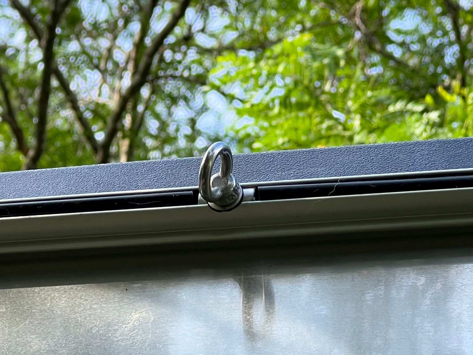 These aluminum barrel nuts slide into the ½" (13mm) Keder Rail™ awning track mounted along the top rim of Airstream Basecamp™ trailers and other 1/2" awning rails. Stainless steel eye bolts are held in place with neoprene-backed stainless steel washers, allowing you to securely anchor your MoonShade to either side of your vehicle.