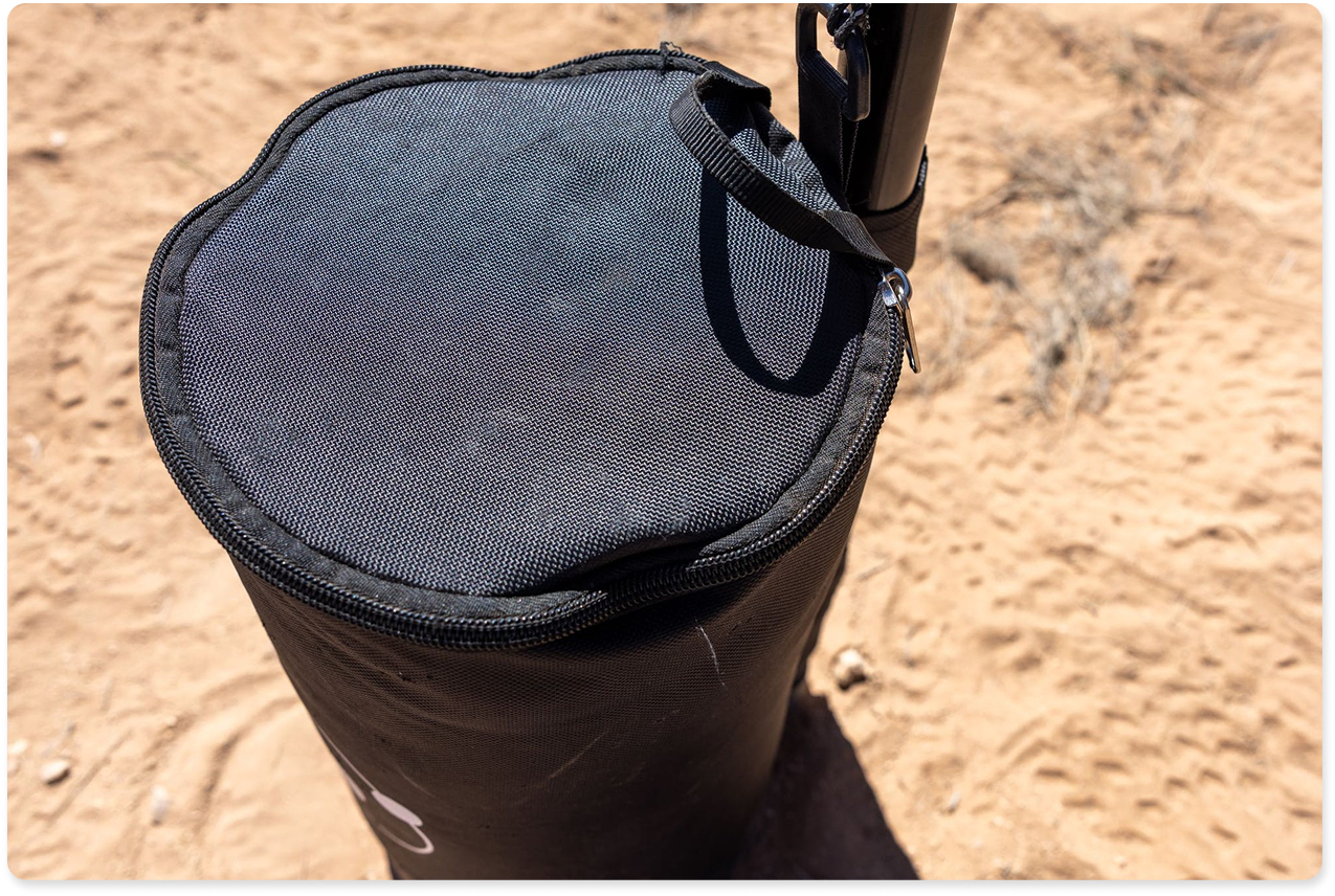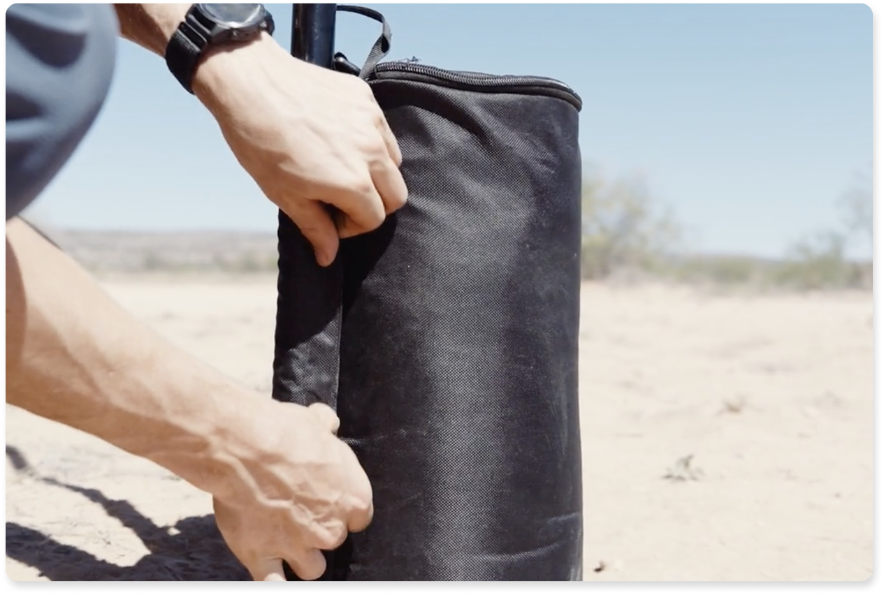To secure Sandbag, wrap the hook and loop wings around the support pole of the MoonShade. Then tie a guyline from top of support pole to sandbag’s D-ring to ensure support poles do not separate in wind.