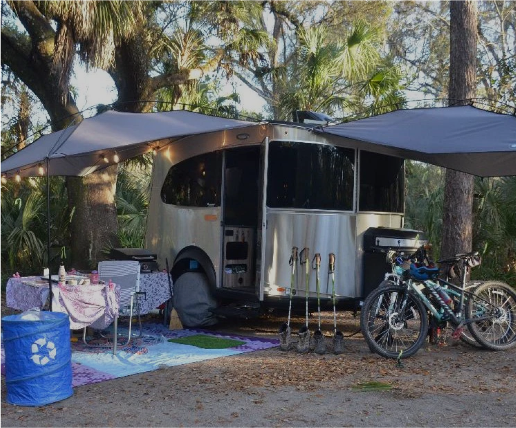 A dynamic duo with a passion for exploring the great outdoors. Both trained as mental health professionals, Tamara lends her expertise to middle school students as a counselor while Tim works in administration for a social service agency specializing in suicide prevention. Their journey together began in 2003, and during the pandemic, Tim's curiosity sparked a new adventure: exploring the world of RVs. He quickly became enamored with the Airstream Basecamp, envisioning endless possibilities for travel and exploration. Determined not to let their Basecamp gather dust, they make it a point to take "Delores," as they affectionately named their trailer after Tim's mom, out at least once a month. With Tim working remotely and Tamara enjoying summers off, they seize every opportunity to embark on new adventures. Their love for travel extends beyond simply hitting the road. As avid bikers, kayakers, and hikers, they use their Basecamp trailer as a literal base camp for their outdoor escapades. Whether it's exploring scenic trails or paddling along tranquil waters, Tim and Tamara embrace every opportunity to connect with nature. To enhance their camping experience, they discovered the Moonshade through a recommendation on a Facebook group. Now proud owners of two Moonshades and a Moonwall, they adapt their setup based on camp layouts and trailer positioning, relishing the shade, privacy and versatility these additions provide. Check them out on Instagram @delores_the_basecamp